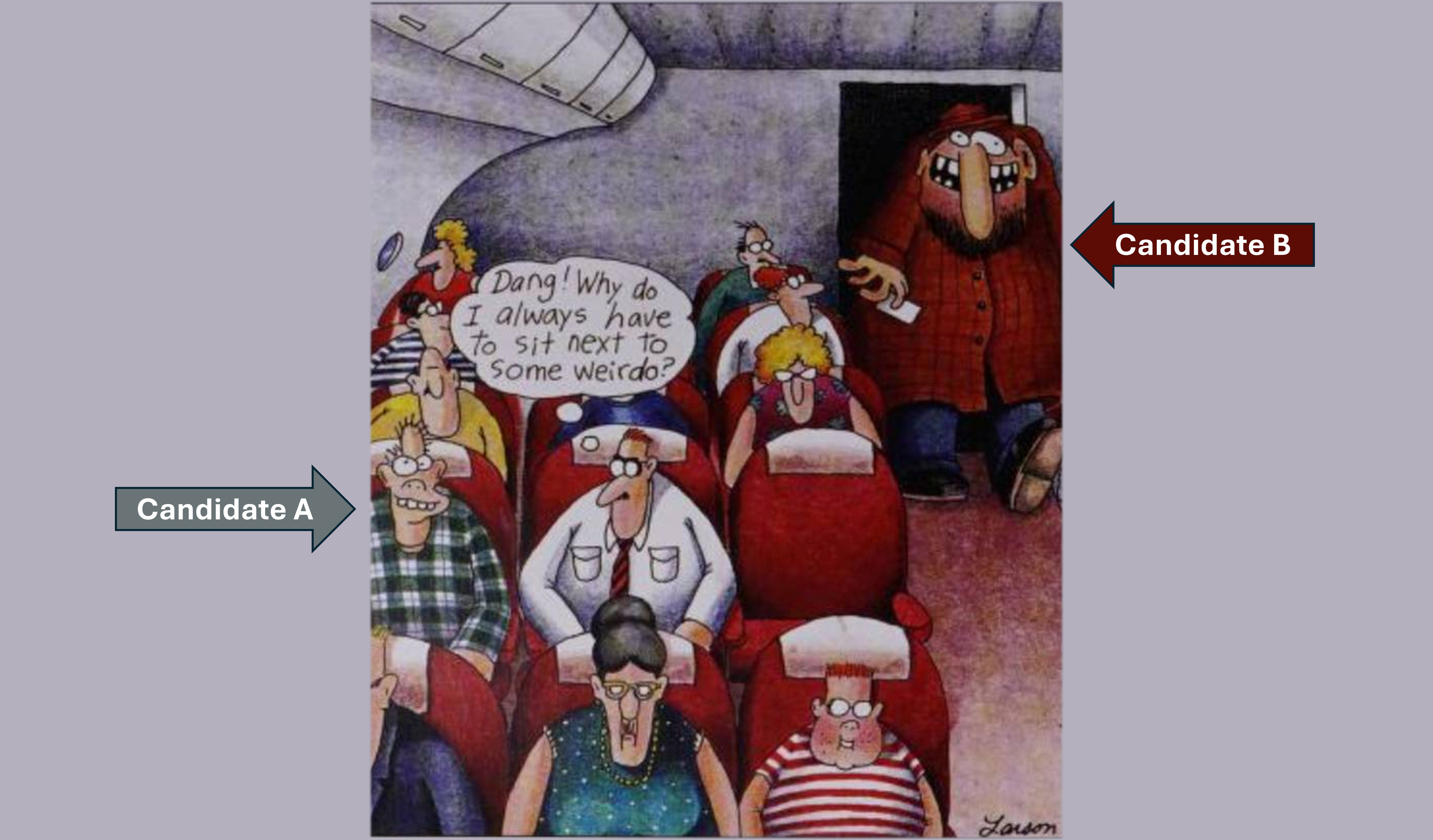 Another reason for Bastiat’s Windows’ eternal non-endorsement stance is that most elections these days remind me of the above classic 1985 cartoon from Gary Larson’s The Far Side. I have many friends and readers who voted for Donald Trump last time and many who voted for Kamala Harris. The aforementioned anthropologists have described sightings of voters who were enthusiastic about each of those candidates, and I have spotted several such people on either side of the aisle with my binoculars. But most of the Harris voters I’ve talked with voted for her primarily because they despised Trump and Republicans; and most of the Trump voters I’ve talked with voted for him primarily because they despised Harris and Democrats. Referring to the cartoon, some saw Harris as Candidate A and Trump as Candidate B, while others saw Trump as A and Harris as B. I have no interest in arguing with purveyors of either viewpoint.