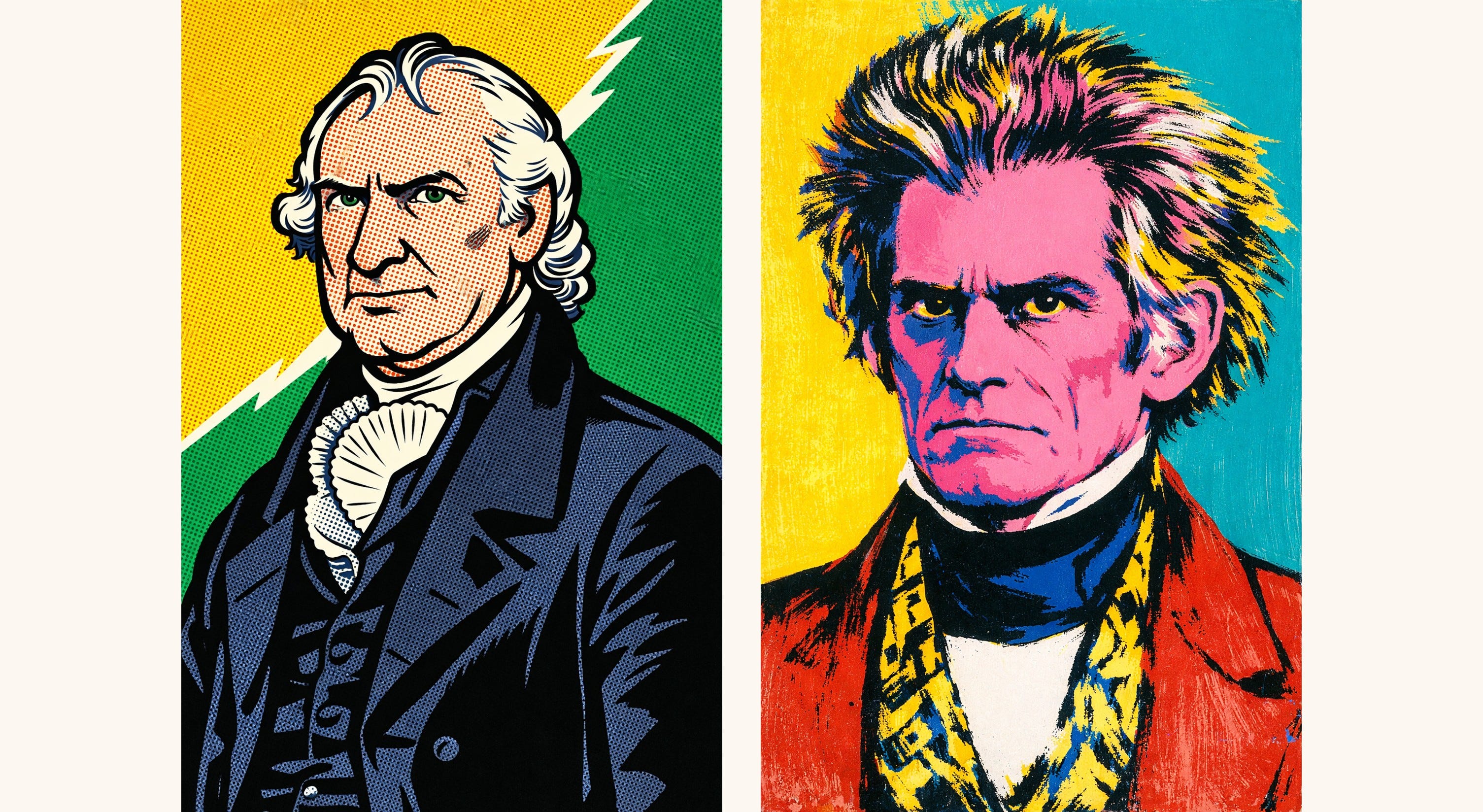 I portrayed Calhoun in the style of Andy Warhol because Calhoun’s hair and clothing remind me of Warhol’s contemporary, Rod Stewart. I portrayed Clinton in the style of Roy Liechtenstein because, well, why not?