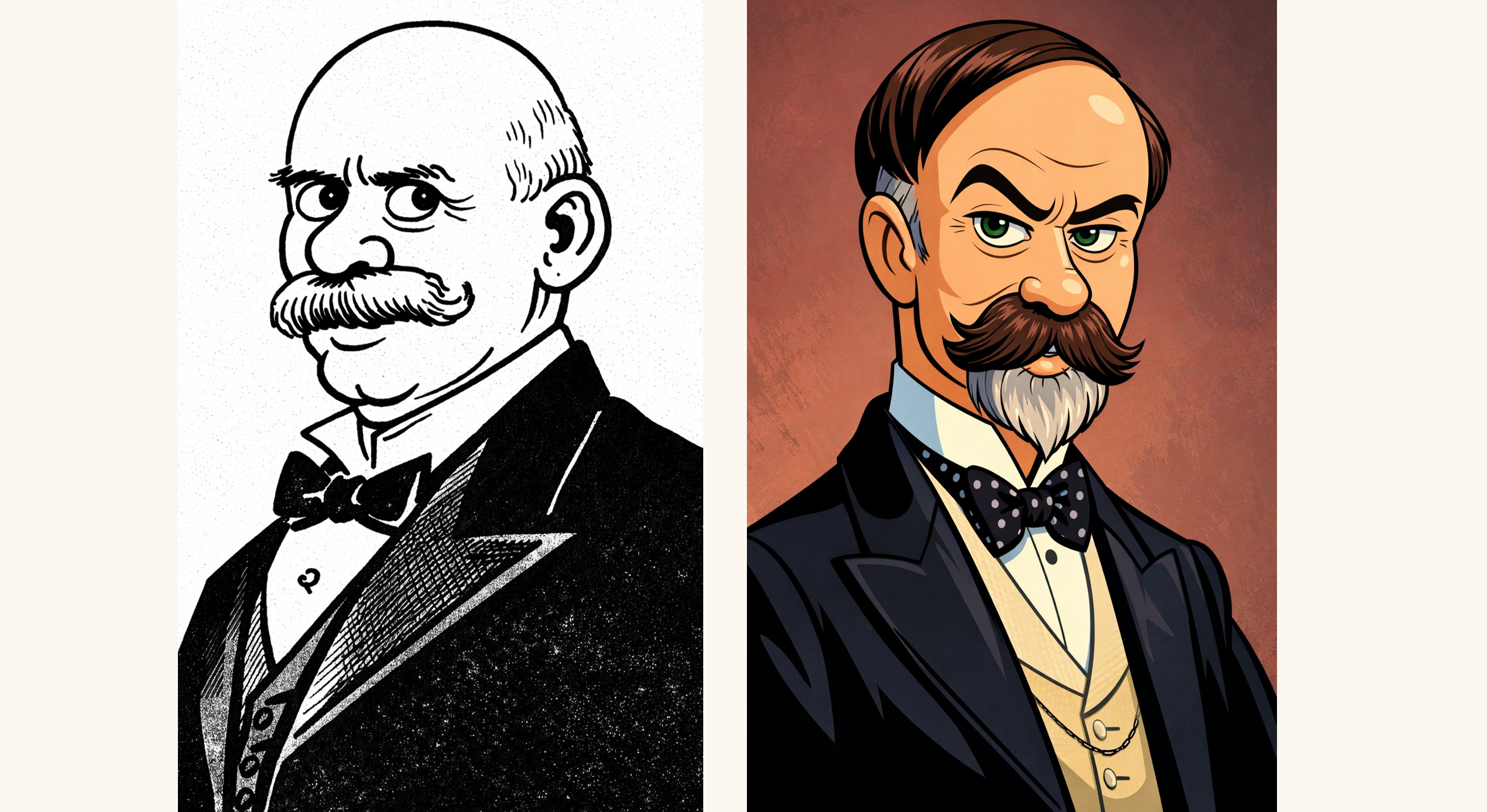 Stevenson is drawn to resemble Mutt, from Bud Fisher’s “Mutt and Jeff” comic strip—because he kind of looked like Mutt. Fairbanks is drawn as a Warner Brothers cartoon character because his photos make him look like someone who would have been personally acquainted with Yosemite Sam.